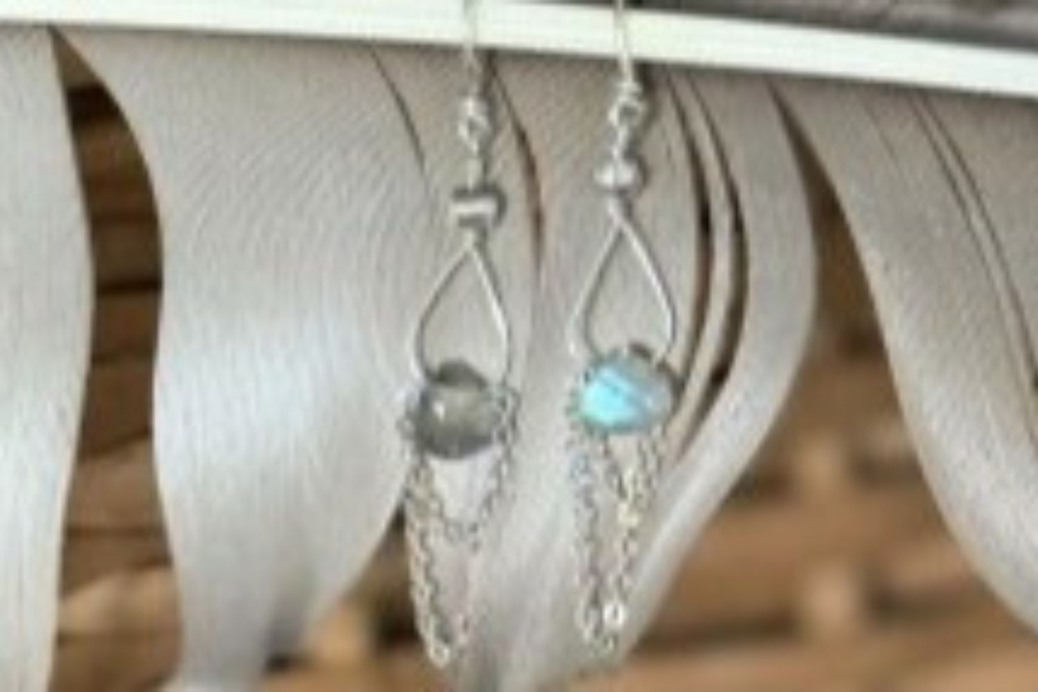 Create a hand formed dangle earring in sterling silver with a gemstone of choice & delicate chain drop. Skills covered in this class include forming, cutting, hammering/texturing, filing, and oxidizing. $35 materials cost paid cash day-of to instructor.